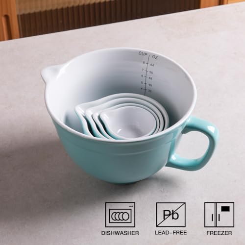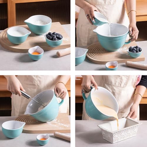 Sweejar Porcelain Mixing Bowl with Scale, Ceramic Serving Container for Kitchen, Nesting Bowl with Handle, Using for Baking, Prepping, Cooking, Set of 5 (Turquoise)