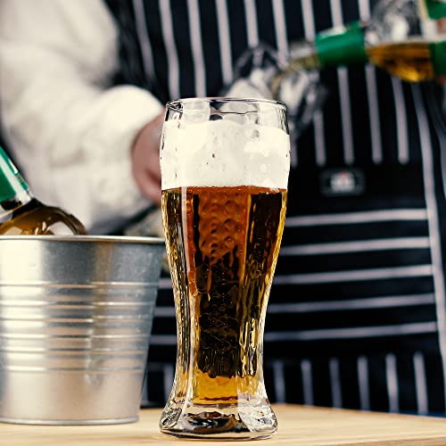 Elegant Slender Hourglass Design – The shape is perfect, artful yet classic. There is a nice, thick base at the bottom that prevents tipping.Sweeping wide head and the curved lip captures the thick, foam head and the natural flavor of your wheat beer.maximize function to beer flavor and aromas.The water-printed body give the beer a more three-dimensional look, while at the same time enhancing the friction between the hands and the cup for a firmer grip.